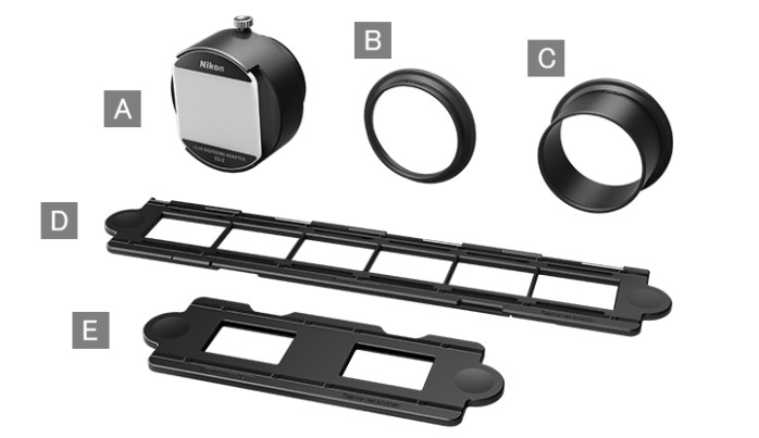 相比上一代產(chǎn)品ES-2重要改進增加了膠片夾具。ES-2一共由5個部件組成,下圖中A是ES-2的核心部件,它負責(zé)連接鏡頭與膠片,可直接安裝APS-C畫幅的AF-S DX Micro NIKKOR 40mm f/2.8G鏡頭,帶有一枚螺絲來控制松緊度。假若要連接AF-S Micro NIKKOR 60mm f/2.8G ED或AI AF Micro-Nikkor 60mm f/2.8D鏡頭,需要使用B或C的62mm轉(zhuǎn)接環(huán)。與此同時ES-2搭配了帶狀膠片夾FH-4、滑動支架FH-5兩種不同的膠片夾具,F(xiàn)H-4、FH-5可調(diào)整俯仰、旋轉(zhuǎn)角度,壓平、傳輸膠片變得非常方便。